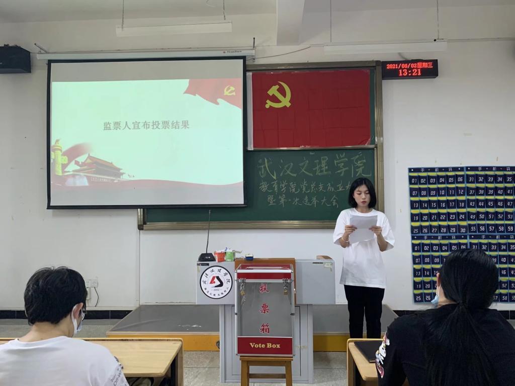 通过各位党员现场投票,监票人与计票人当众清点选票后,由党务小组刘梦茵同志向大会报告计票结果。经大会选举,刘超、刘伊、何昱霖三位同志当选教育公司党总支委员会委员;刘伊、张萍丽、高琴三位同志当选太阳成tyc33455ccwww教职工党支部委员会委员;何昱霖、肖昌浩然、高凯三位同志当选太阳成tyc33455ccwww员工党支部委员会委员。