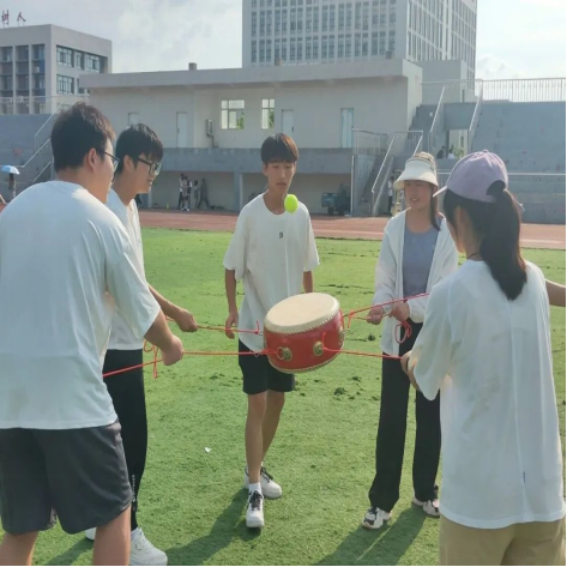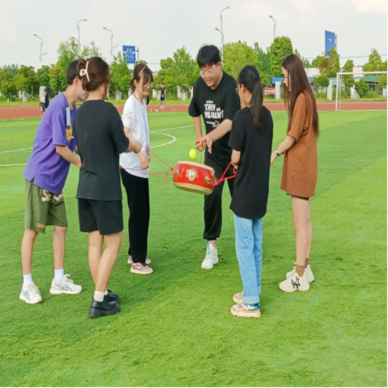 鼓动人心游戏是一种团队协作项目,要求队员在保证安全的情况下,创造尽可能多的掂球记录。在8分钟的时间内,每个同学都要集中注意力,鼓要平,心也要平,形成一种合力,争取在有效的时间里掂更多的球。