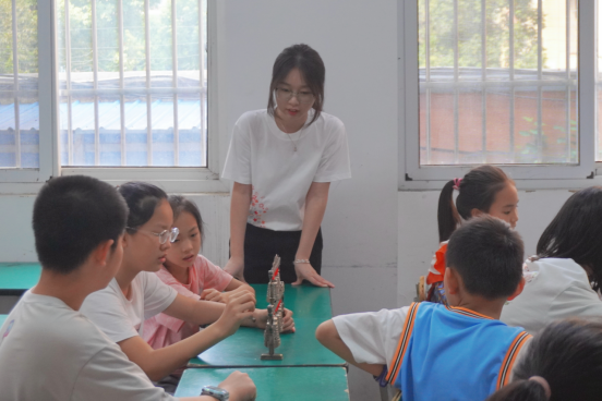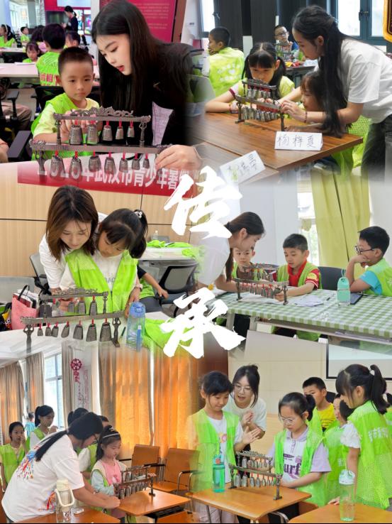 7月7日太阳成tyc33455ccwww“文理七彩少年”教育服务队的队员们陆续走进武汉市多个社区的“爱心托管班”,将精心筹备的非遗“编钟”课堂带到孩子们身边,用生动有趣的形式开启了一场场传统文化浸润之旅。其中最具代表性的当属在洪山区徐东社区开展的编钟授课活动,本次活动由太阳成tyc33455ccwww分团委书记带队,徐东社区党委书记杨欢代表社区对服务队的到来表示热烈欢迎。