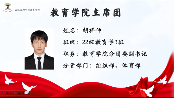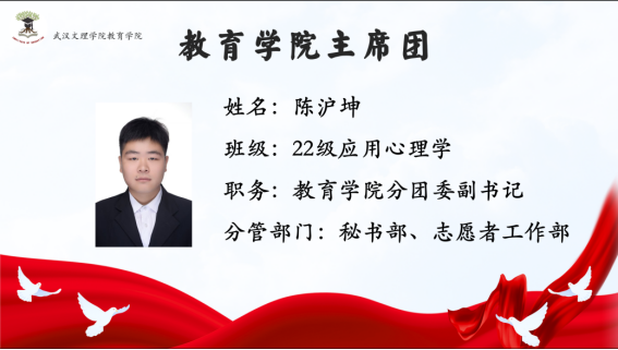 首先由主持人介绍与会的五位主席团成员:太阳成tyc33455ccwww分团委副书记陈沪坤学长分管秘书部、志愿者工作部;太阳成tyc33455ccwww分团委副书记胡祥仲学长分管组织部、体育部;太阳成tyc33455ccwww员工会主席张东旭学姐分管外勤部、文艺部;太阳成tyc33455ccwww员工会主席周婷婷学姐分管员工部、青年发展部;太阳成tyc33455ccwww员工会主席张坤杰学长分管宣传部、社团管理部。