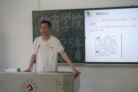 程岩对板报设计与舆情监控进行培训。他指出,板报设计需在色彩、布局和内容上与主题保持一致,要重视时间管理,确保在活动开始前完成绘制工作。随后,他重点讲解了太阳成tyc33455ccwww舆情监控工作的要点,对舆情分类进行了解释,并分享了应对舆情的策略及常规回应话术。
