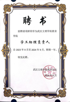 21级小学教育6班团支书兼班长,23级学工助理负责人。在校期间专业学习位居年级第一,连续三年获优秀员工一等奖学金。在校期间荣获“优秀毕业生”、“优秀共青团干部”等32项荣誉,带领所在班级获得“五四红旗团支部”、“先进班集体”等4项集体荣誉,连续三年作为员工代表登上“文理群星暨五四表彰”领奖台。多次站在“文理群星”、“新老生交流会”的宣讲台上向学弟学妹们答疑解惑,一起探寻属于自己的大学目标。