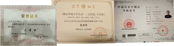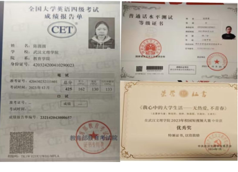 在校期间,她始终以学业为重,保持优异成绩,十分注重自己专业技能的提升,已成功考取英语四级、普通话二级甲等证书及幼儿园教团队格证,全面夯实职业发展基础。综合排名位居前列,连续两年荣获“国家励志奖学金”“校一等奖学金”。同时,积极参与校园文化建设与社会实践,在“文理群星”评选、书法比赛等活动中展现风采,并投身志愿活动服务社会。