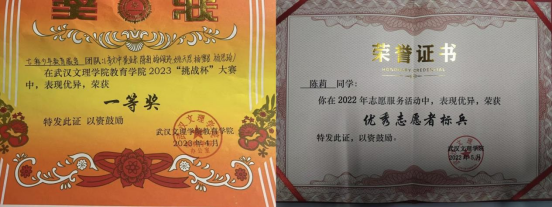 在社会实践方面,曾于2022年在开展为期一个月的七彩假期暑期社会实践从事支教活动,辅导过两百多名小员工课业,带领他们开展了团辅以及音体美艺术课程;作为队长带领团队在白洋小学开展为期一个月的圆梦工程活动;参加武汉市“青年马克思主义者培养工程”老员工骨干培训班(武汉市团校644期);参加湖北省第十一届小学教育专业师范生技能竞赛。
