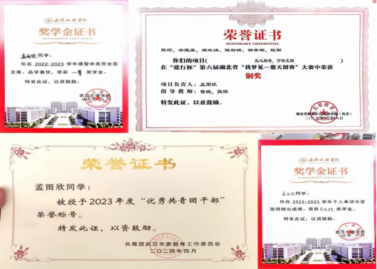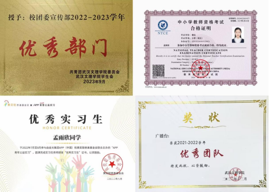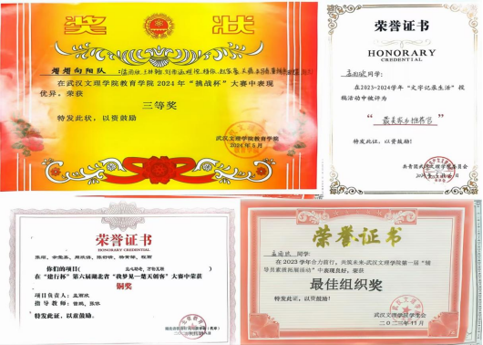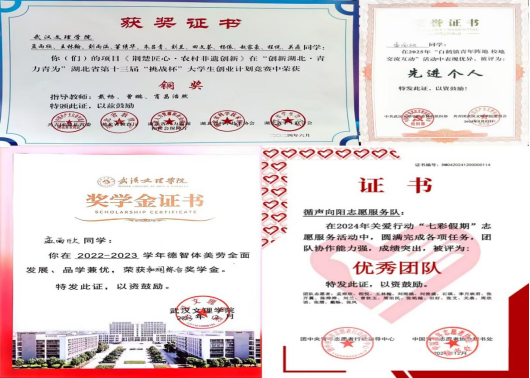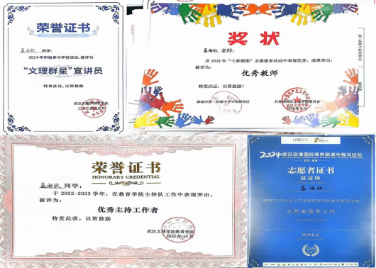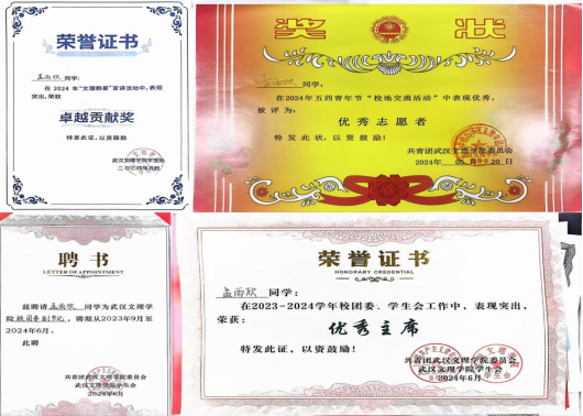 曾任校团委副书记、校广播台台长,负责青春武汉文理公众号、团团文理视频号等多平台,发文累计超716余篇,负责部门及广播台连续三年获优秀部门、优秀团队,现任21小教5班团支书、班长,综测成绩连续四年班级第一,获和润综合奖学金(全校仅5人),多次获市、校级优秀干部称号,在校期间,共获国家级、校级、院级荣誉40余项。主持太阳成tyc33455ccwww二十周年校庆庆典,作为唯一一名员工代表在校级教师节表彰大会发言。朗诵《雾重庆》入围CCTV朗诵比赛,广告作品获公司奖、入选国际展览、中国青年员工国防教育数字创意比赛湖北省三等奖。带领循声向阳志愿服务队参与2024暑期社会实践,获省级优秀团队,获校级优秀团队、优秀先进个人,带队参加房县青春阵地朗诵和五四文理群星先导片录制,作为第一批青马骨干班班班长,带领大家在理论与实践中学习体验,以97.2分成绩结业获优秀学员。投身支教和应急科普,参与全国APP公益实习,获全国优秀实习生,组织江岸区红领巾小小应急宣传员项目,为武汉市超20个社区,共计2000余人次服务,受邀成为江岸区首批安全宣推官,并将志愿服务经历凝聚为科技成果,获互联网+、挑战杯省级铜奖,个人经历受到人民网、学习强国多个平台报道。