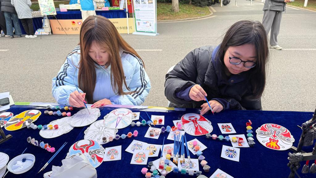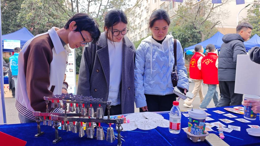 下午两点,公益展示环节正式开始。服务队通过成果展板陈列、非遗实物体验与互动讲解相结合的形式,向现场师生及各高校代表全面展示了团队志愿服务的特色亮点与实践成效。展位前吸引了众多师生驻足,大家亲手体验敲击编钟、绘制楚剧脸谱,在沉浸式互动中感受非遗文化的魅力。