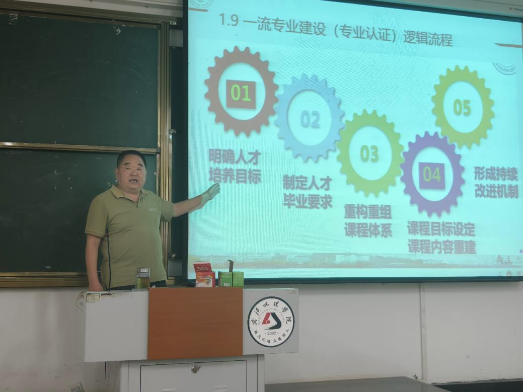 随后,李耀宗处长紧抓一流课程如何建设、怎样申报的问题,向大家分享了自己的经验,对于一流课程建设,他阐述了五步走的观点。第一步明确人才培养目标、第二步制定人才毕业要求、第三步重构重组课程体系、第四步课程目标设定及课程内容重建、第五步形成持续改进机制的逻辑流程。会议里,李处长还围绕关于课程建设中的问题解决、考试试卷、课程达成的分析报告、创新点等各方面,通过多年经验提出了新颖观点与要求。