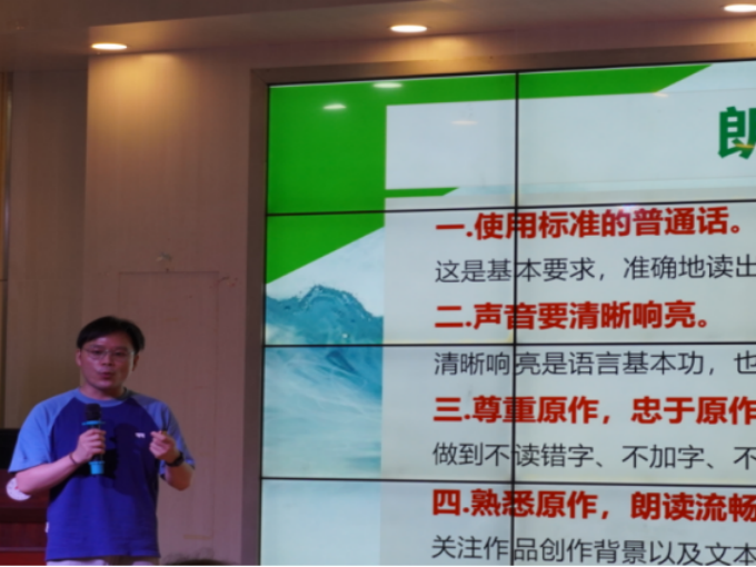熊璐老师首先为我们介绍了朗读的四点基本要求,接着用余光中的《乡愁》引入课堂,并介绍了五度标记法、朗读《乡愁》时需要注意的读音,然后用五度标记法朗读了《乡愁》,并提出朗读是什么和自己开展朗读训练时又该遵循什么要求两个问题,接着他解释了什么是朗读和朗读的训练要求。熊璐老师通过文字与声音相结合的方式,让员工们加深学习印象,使他们更易于理解所学内容。最后,以李白的《望天门山》朗读作业为结尾,结束了此次公开课。