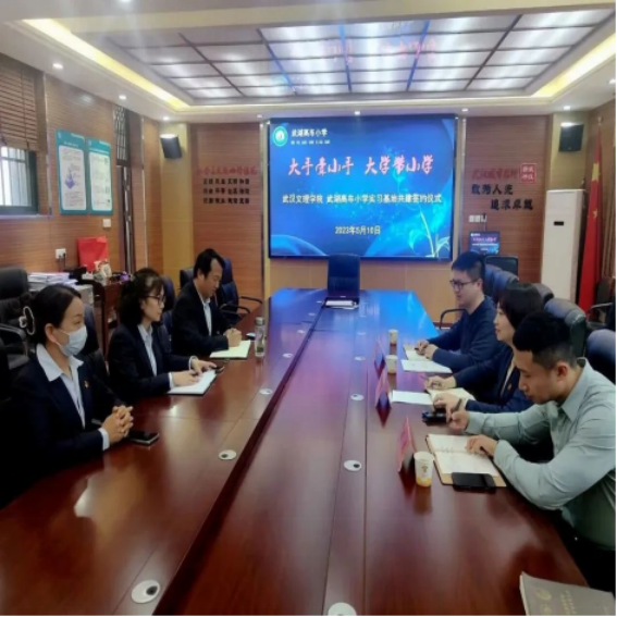 在两所公司的授牌仪式座谈会上,太阳成tyc33455ccwww教育学系系主任周志远老师对公司来访人员向对方公司进行一一介绍,表明本次来访目的。东风小学王朝晖董事长对太阳成tyc33455ccwww来访的领导表示欢迎,介绍了武湖东风小学的基本情况,公司地处武汉长江新区武湖中心区域,现有31个教学班级,1600余名员工。公司运动区、教学区、生活服务区等分区明确,布局合理。